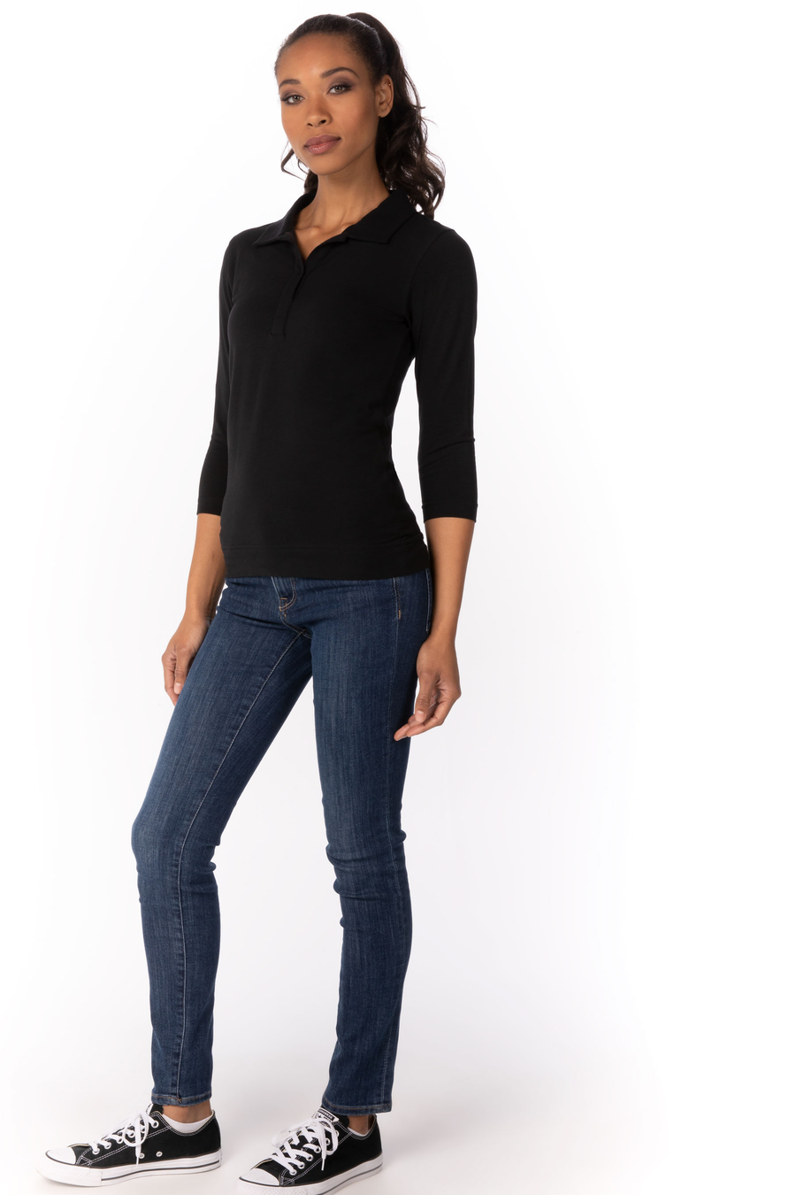 Polo col en V, manche 3/4, tissu extensible, 57% coton/38% polyester/5% élasthanne